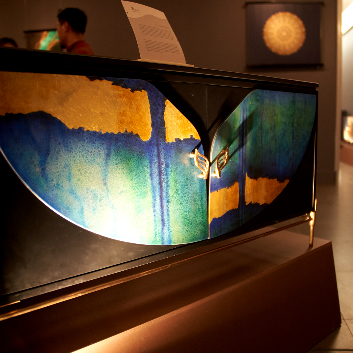 Từ xa xưa, thuyết vật linh là một tín ngưỡng cổ xưa về mối liên kết tâm linh giữa tất cả các dạng và yếu tố tự nhiên: con người, động vật, thực vật, đất, không khí, lửa và nước. Lấy cảm hứng từ loài bọ cánh cứng cổ xưa với lớp vỏ màu ánh kim rực rỡ đặc biệt, nhà thiết kế đã sáng tạo họa tiết mang câu chuyện của thế giới đa sắc màu, trù phú, lộng lẫy, giàu có và vô tận đi vào không gian sống tưởng như siêu thực, đặc biệt là khi ứng dụng kỹ nghệ tạo bề mặt và màu sắc huyền ảo, vô thực của nghệ thuật sơn mài, vô hình chung đã trình diễn một ý niệm của nghệ thuật hay hội họa đương đại trong tác phẩm.