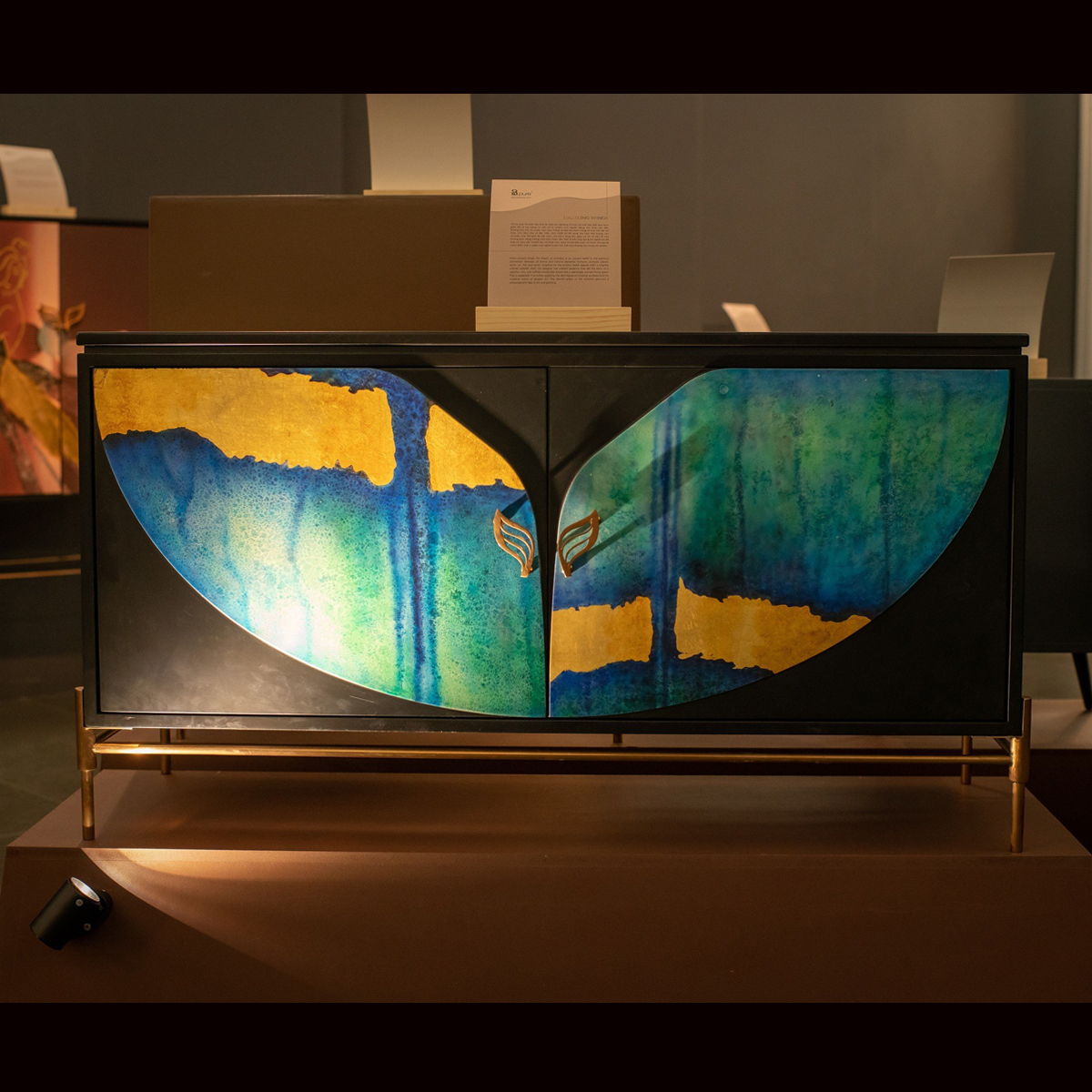 Từ xa xưa, thuyết vật linh là một tín ngưỡng cổ xưa về mối liên kết tâm linh giữa tất cả các dạng và yếu tố tự nhiên: con người, động vật, thực vật, đất, không khí, lửa và nước. Lấy cảm hứng từ loài bọ cánh cứng cổ xưa với lớp vỏ màu ánh kim rực rỡ đặc biệt, nhà thiết kế đã sáng tạo họa tiết mang câu chuyện của thế giới đa sắc màu, trù phú, lộng lẫy, giàu có và vô tận đi vào không gian sống tưởng như siêu thực, đặc biệt là khi ứng dụng kỹ nghệ tạo bề mặt và màu sắc huyền ảo, vô thực của nghệ thuật sơn mài, vô hình chung đã trình diễn một ý niệm của nghệ thuật hay hội họa đương đại trong tác phẩm.